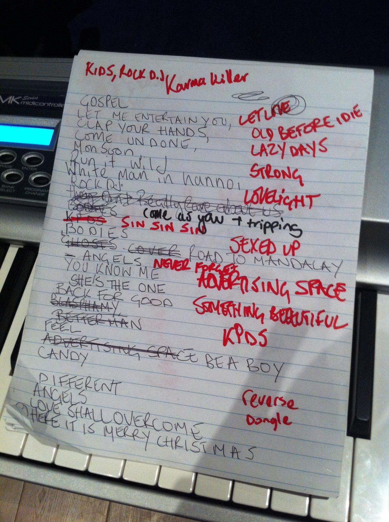 Robbie a posté hier soir une photo d'une Setlist avec beaucoup d'annotations, en mettant le commentaire suivant : "Just Doing My Homework" (Je fais mes devoirs).