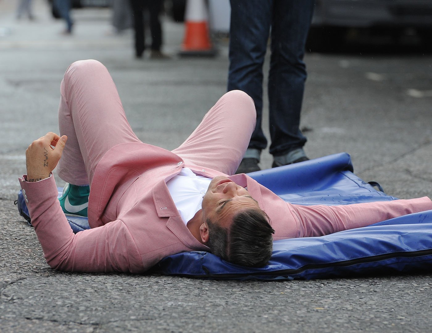 Robbie, tout de rose vêtu, a amusé les passants qui ont pu voir le chanteur tourner son clip, en pleine rue !